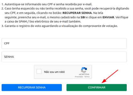 Tenha em mãos o CPF e senha (está será recebida por e-mail) e clique em CONFIRMAR, mas antes marque a opção: