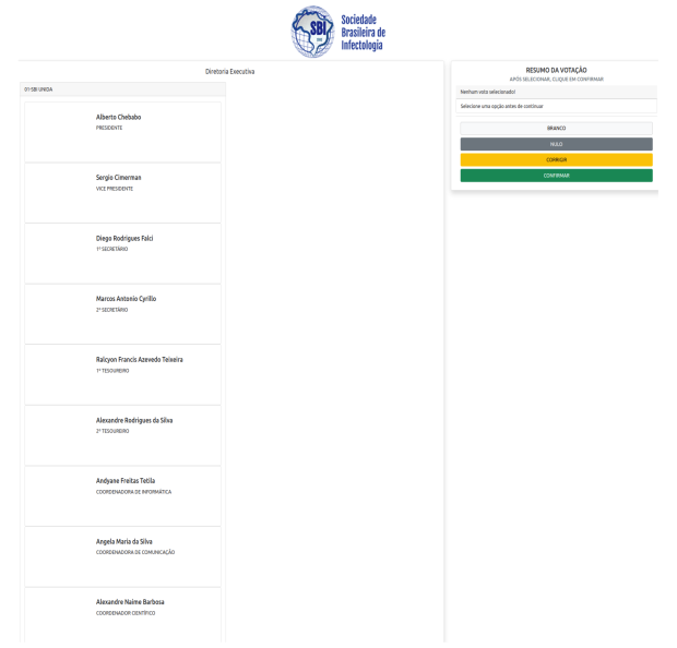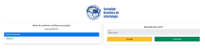 Escolha sua opção de voto e clique no botão CONFIRMAR, todavia, caso julgue necessário também é possível CORRIGIR a seleção. Lembramos que os votos BRANCO e NULO também estão disponíveis ao eleitor.
